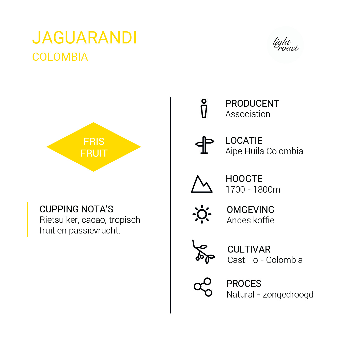 Colombiaanse koffie staat al lang op ons verlanglijstje. Deze koffie groeit op de warme hellingen van noord-Huila en draagt het wilde karakter van die plek in zich. Hij is vernoemd naar de jaguarandi, een Klien, bijna onzichtbaar kastje dat overal zijn weg vindt. De rijpe bessen worden met de hand geplukt en in de zon gedroogd - helemaal in hun vrucht - zodat alle zoete en tropische smaken naar voren komen.