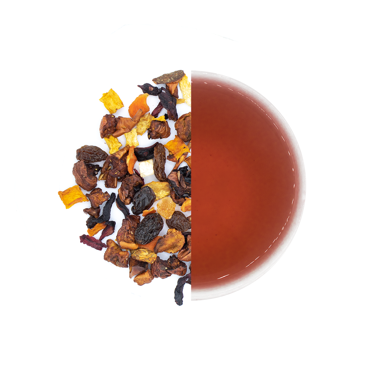 Gekonfijte papajastukjes, hibiscus bloemen, appelstukjes, rozijnen, rode bietstukjes, pompoenstukjes, gember, nootmuskaat en kaneel.