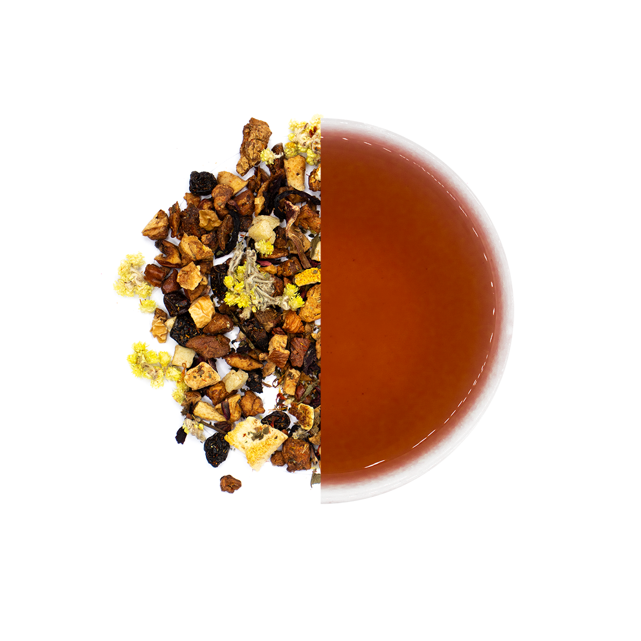 Appelstukjes, zure appelstukjes, ananasstukjes, hibiscusbloesem, Korinthische rozijnen, sinaasappelschijfjes, zoete braambesbladeren, zeste van sinaasappel, saffloer, citroenschil en rozenkransje.