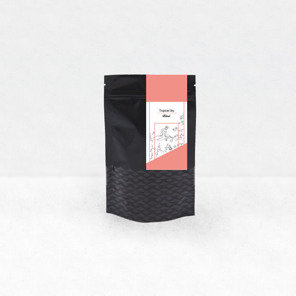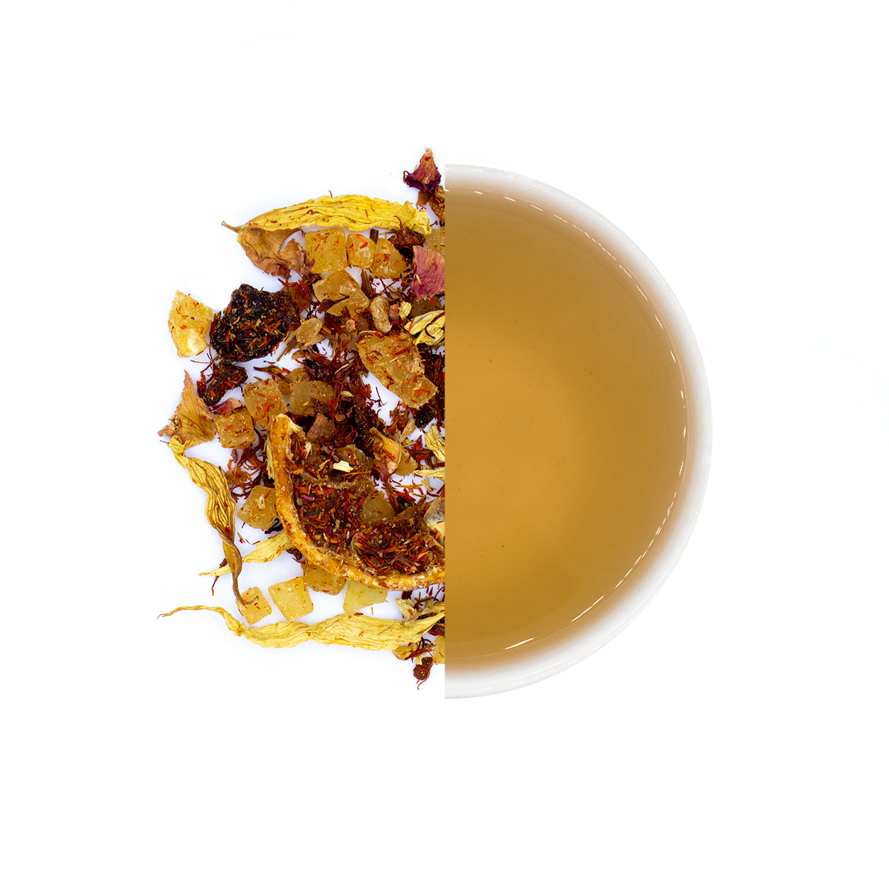 Gekonfijte ananasstukjes, appelstukjes, gekonfijte papayastukjes, gekonfijte mangostukjes, mandarijnstukjes, physalis, saffloerbloesem, rozenbloesem en zonnebloembloesems.